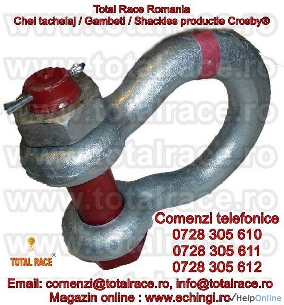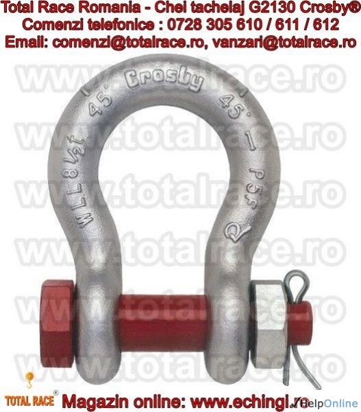 Total Race comercializeaza cu livrare din stoc Bucuresti: chei tachelaj omega cu bolt filetat, pilita si stift de blocare, chei de tachelaj model G 2130 tip omega marca Crosby, , chei tachelaj capacitate intre 0, 33 Tone si 150 Tone . Chei de tachelaj cu factor de siguranta: MBL = 6 x WLL (Sarcina maxima de lucru), cheie tachelaj: Forjat-Calit si Temperat, material otel aliat, galvanizata la cald. Capacitatea stantata permanent pe shackles. Cheile de tachelaj peste capacitate WLL= 25 tone sunt echipate RFID. Cheile de tachelaj Crosby® se livreaza cu certificate de calitate CE de la producator. Pentru detalii accesati: www.echingi.ro & www.cheitachelaj.ro
