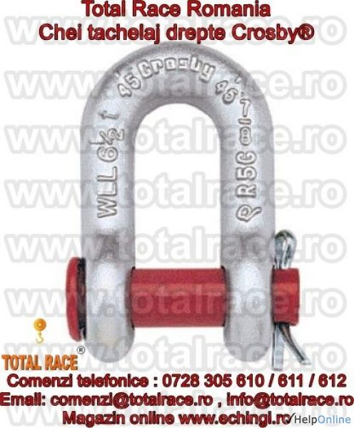 Total Race Romania comercializeaza gambeti tip lira / drept marca Crosby®, chei tachelaj dreapte cu bolt filetat, gambeti tip lira, shackles Crosby® ce au capacitati cuprinse intre 0.5 Tone si 55 Tone . Au factor de siguranta: MBL = 6 x WLL (Sarcina maxima de lucru), material otel aliat, galvanizat la cald ( Forjat- Calit si Temperat ). Capacitatea este stantata permanent pe shackles . Cheile de tachelaj Crosby® se livreaza cu certificate de calitate CE de la producator.