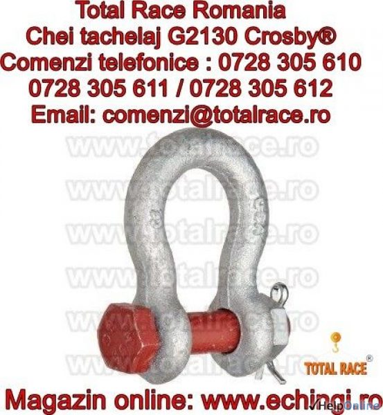 Total Race comercializeaza: chei tachelaj forjate Omega G2130 Crosby®, cheie tachelaj cu bolt, piulita si stift de blocare, chei tachelaj capacitate intre 0, 33 Tone si 150 Tone . Cheile de tachelaj sunt in conformitate cu: EN 13889: 2003 si indeplinesc cerintele de performanta ale Fed. Spec. RR-C271D tip IVA, grad A, Clasa 2. Chei de tachelaj cu factor de siguranta: MBL = 6 x WLL (Sarcina maxima de lucru), cheie tachelaj: Forjat-Calit si Temperat, material otel aliat, galvanizata la cald. Capacitatea stantata permanent pe shackles. Cheile de tachelaj peste capacitate WLL= 25 tone sunt echipate RFID. Cheile de tachelaj Crosby® se livreaza cu certificate de calitate CE de la producator.