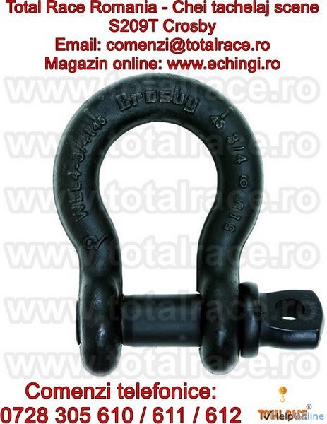 Total Race comercializeaza: chei de tachelaj pentru scena/ teatru / circ / concerte, chei de tachelaj model S 209T tip omega marca Crosby, cheie tachelaj cu bolt filetat . Chei de tachelaj cu capacitati intre 1 tona si 4, 75 tone. Gambetii sunt in conformitate cu EN 13889 si indeplinesc cerintele de performanta ale Fed. Spec. RR-C271D tip IVA, grad A, Clasa 2, ASME B30.26. Cheile de tachelaj au factor de siguranta: MBL = 6 x WLL (Sarcina maxima de lucru), shackles Forjat - Calit si Temperat, cu bolt aliat, material otel aliat, capacitatea stantata permanent.