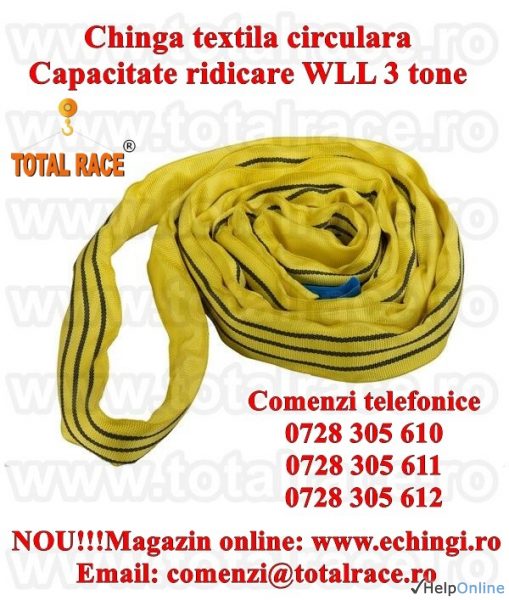 Total Race Romania va ofera chinga textila de ridicare circulara capacitate 3 tone lungime utila 6 metri, lungime desfasurata 12 metri, culoare galbena productie UTX Olanda. Chingile/sufele circulare se livreaza insotite de Declaratie de Conformitate, tabel de sarcini si instructiuni de utilizare.Pentru orice chinga de ridicare pe care nu o mai folositi indiferent de producator, capacitate de ridicare, lungime si o predati la sediul nostru din Bucuresti primiti garantat 20 % discount din pretul de lista pentru o noua chinga de ridicare achizitionata. Pentru preturi si disponibilitate stoc accesati magazinul nostru online: www.echingi.ro/ www.echingi.com /www.chingiridicare.ro