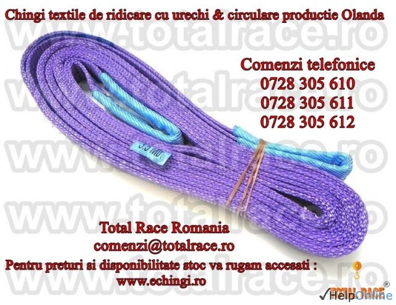Total Race Romania comercializeaza cu livrare din stoc Bucuresti: chingi textile de ridicare cu urechi, chingi textile circulare, chingi circulare negre pentru scene, teatru, sufe de ridicare textile, chingi speciale pentru tamburi de otel cu muchii taioase si ascutite, dispozitive de chingi de ridicare, chingi construite in 2 straturi, chinga cu coeficient de siguranta 7: 1, chingi productie Olanda, chingi cu tonaj pana la 200 tone, dispozitive din chingi de ridicare, ridicare profesionala, chinga techlon, chinga Dyneema, chingi cu livrare din stoc, chingi cu lungimi la comanda, chingi de ridicare cu urechi pentru hale industriale, chingi de ridicare europaleti, chingi de ridicare pentru macarale, chingi de ridicare pentru utilaje constructii, chingi de ridicare pentru butoaie.