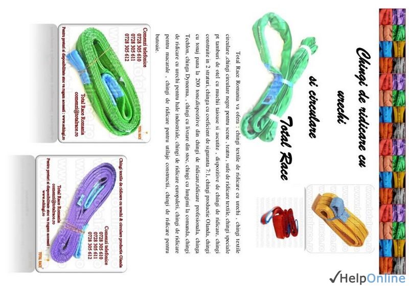 Chingi textile poliester capacitate 10 tone lungime utila 6 metri, lungime desfasurata 12 metri, culoare portocalie, productie Olanda, se livreaza insotite de Declaratie de Conformitate, tabel de sarcini si instructiuni de utilizare.