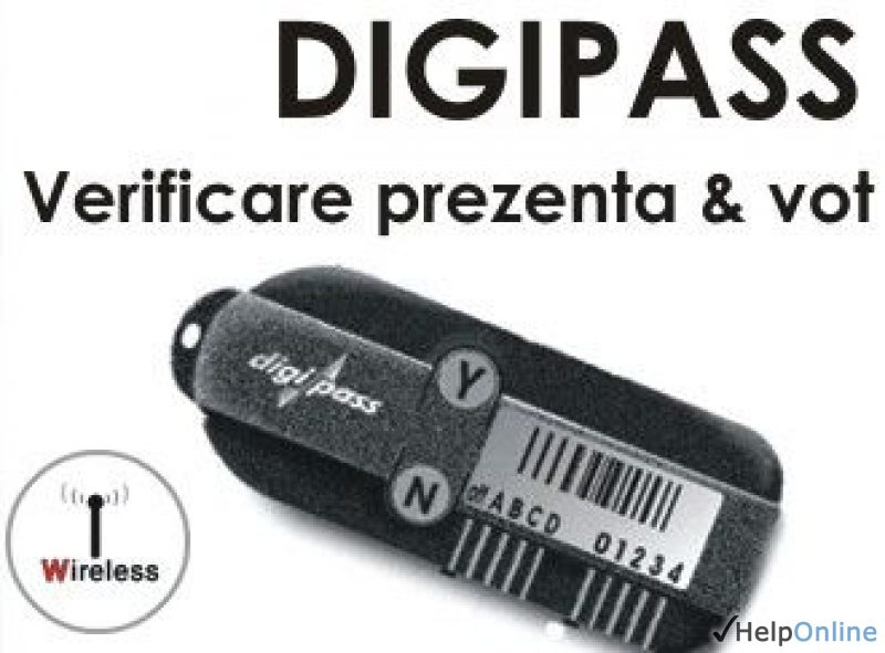 DigiPass este un sistem wireless, economic, cu dubla-functie: detecteaza prezenta si poate fi folosit ca sistem de votare. Pentru functia de vot, aparatul este prevazut cu doua butoane: da, nu/ true/false. Poate identifica pana la 20 de coduri diferite in 20 de camere diferite. Inovativ si fiabil, sistemul scaneaza la fiecare 5 min fiecare aparat (ID) pentru a inregistra exact prezenta in sala. Permite conectarea a max. 8 antene la PC si functionarea simultana a 4096 de ID-uri diferite, fara interferente. Contactati-ne pentru detalii si demonstratii gratuite de functionare. axialacustic@yahoo.com, 0213303669