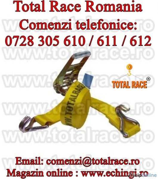 Oferta Constructii Calarasi - Total Race comercializeaza cu livrare din stoc Bucuresti chingi de ancorare sistem 75 mm cu latime banda 75 mm, in conformitate cu EN 12195 - 2, elongatie < 7 % cu clichet Stf 500 daN, din 2 parti, carlige diverse modele ; din poliester, culoare galbena. Capacitatea...