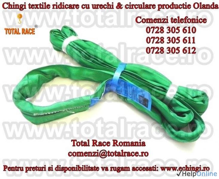 Total Race Romania va ofera: chingi textile de ridicare cu urechi, chingi textile circulare, chingi circulare negre pentru scene, teatru, sufe de ridicare textile, chingi speciale pt tamburi de otel cu muchii taioase si ascutite, dispozitive de chingi de ridicare, chingi construite in 2 straturi, chinga cu coeficient de siguranta 7: 1. Accesati: www.echingi.ro, www.totalrace.ro /www.echingi.com