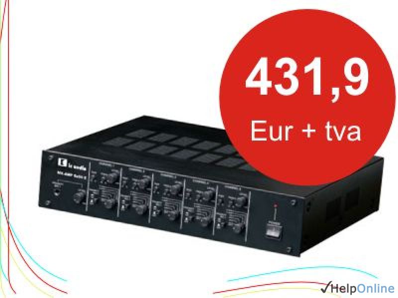 MX-AMP5x50E mixer audio cu amplificare, 5x50W/100V, iesiri speaker: 8ohm, 70V, 100V; pret mixer amplificat 432 euro+tva. Ideal pt difuzare muzica si voce in instalatii de sonorizare PA mici si medii- sonorizari magazine, amplificari cabinete medicale.