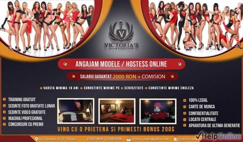 Cautam tinere indraznete, dinamice, ambitioase, serioase, pentru conversatii online. Daca ti se potriveste profilul esti la locul potrivit! Echipa noastra iti ofera un mediu placut de lucru, in studiouri moderne, situate central si dotate cu aparatura de ultima ora. Training, suport tehnic 24/7, sedinte foto/video, toate gratuite! Program full time/part time, plati bilunar, bonusuri. Cerinte: minim 18 ani, limba engleza, operare pc. Tel. 0733278659, 0764878500, www.victoriastudio.ro, facebook Victoria's.studio.