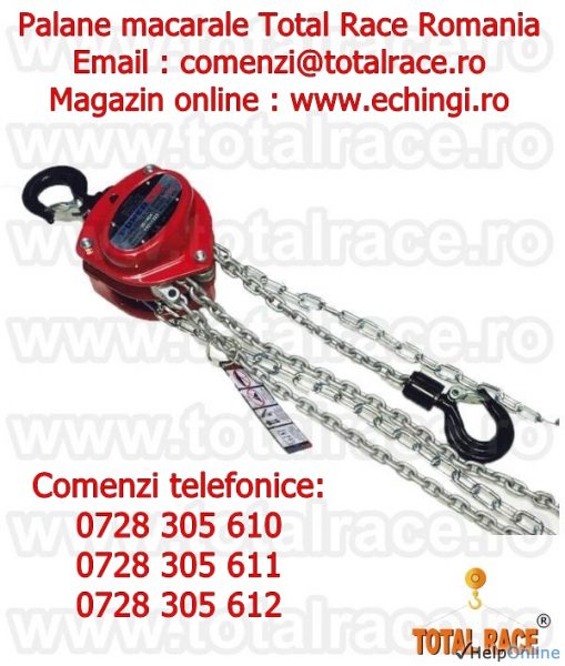 Total Race livreaza din stoc Bucuresti palane manuale cu lant pentru instalare echipamente, scripete cu lant pentru incarcare sau descarcare de marfuri, macarale cu lant grad 80, palan cu lant de sarcina acoperit cu strat de protectie anticoroziv, dispozitive de ridicare portabile, macara cu lant pentru manevrare sarcini mari si utilizari intense, in conditii de siguranta deplina, palane productie Suedia. Pentru preturi, date tehnice si stoc accesati magazin online: www.echingi.ro