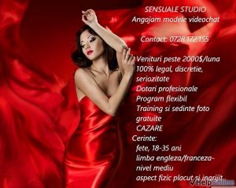 Cauti un loc de munca atractiv? Esti simpatica, conversezi in limba engleza si vrei sa ai un venit stabil? E simplu! Sensuale Studio Videochat iti pune la dispozitie locatie moderna, echipamente profesionale, mediu de lucru placut, training, sedinte foto si cazare. Program flexibil, salariu intre 800 si 4000 $/luna, bonusuri. O echipa bine pregatita te va sprijini in permanenta! Tel. 0728172155, facebook Studio Sensuale.