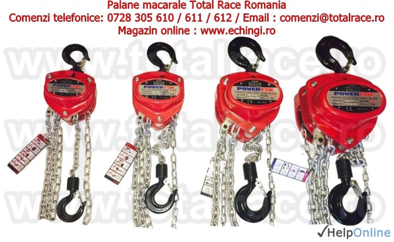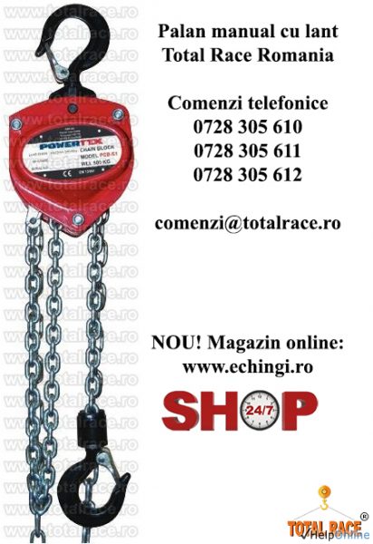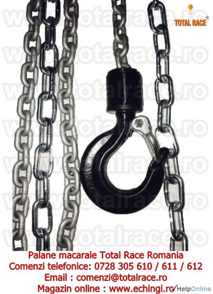 Total Race comercializeaza cu livrare din stoc Bucuresti palan manual cu lant, palane profesionale, palan cu carcasa de otel si carlige rotative cu siguranta, palane cu lant de sarcina acoperit cu strat de protectie anticoroziv, macarale manuale cu lant echipate cu chip RFID pentru o usoara intretinere si inspectie, palane manuale cu lant capacitati intre 0, 25 tone - 10 tone, palane mecanice cu lant grad 80, macara cu lant productie Suedia. Pentru preturi, date tehnice si stoc accesati magazin online: www.echingi.ro