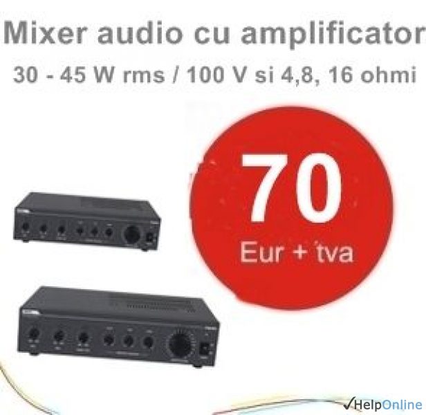 AMP03 mixer audio cu amplificare, 2 intrari mic, 30 - 45 W rms / 100 V si 4, 8, 16 ohmi, pret mixer 70 euro + tva. Permite conectare microfoane anunturi, se integreaza in orice tip de sonorizare PA pt difuzare muzica sau anunturi. Pt oferte sonorizari profesionale AMRO Grup - vanzari@amro.ro, 021-330.36.69, 0745-097.264, www.amro.ro