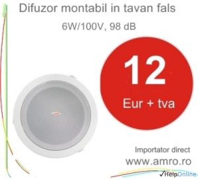 Difuzor montabil tavan fals, 6W/100V, 98 dB, pret boxa audio 12 eur+tva. Cod comanda CSE06T, Proel. Recomandat pt sonorizari restaurante, amplificari magazine; asigura o calitate audio superioara. Sisteme sunet, sonorizari in tavan fals- contactati importator audio AMRO Grup, 021 330 36 69, mob. 0745 097 264, vanzari@amro.ro, www.amro.ro
