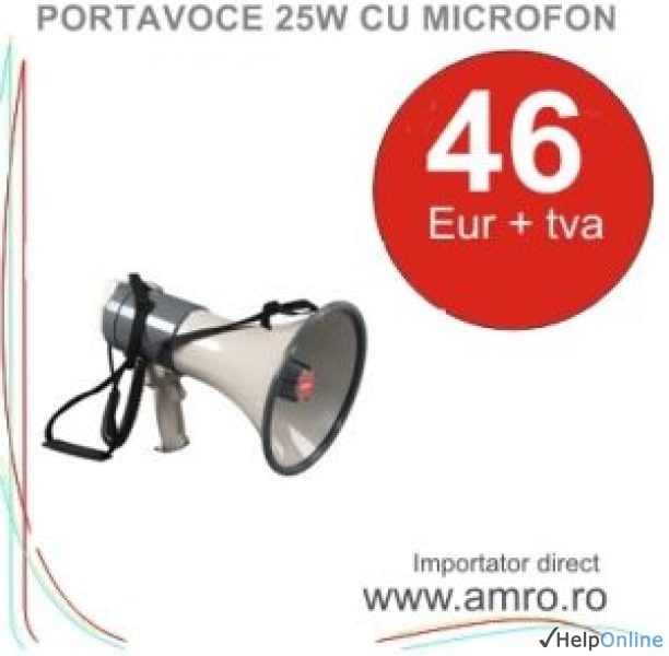 MEG25 megafon cu amplificare, 25W, din ABS, acopera cca1km, alimentare cu baterii; Pret portavoce 46 Eur+tva. Dotari: microfon cu fir, control volum, rezistenta conditii atmosferice extreme. Aplicatii sonorizari campanii electorale, amplificare voce miting-uri, evenimente comerciale. Detalii amplificari mobile pe vanzari@amro.ro, 021 330 36 69, 0745 097 264, www.amro.ro