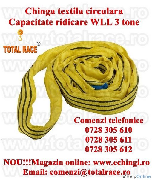 Total Race Romania va ofera chinga textila de ridicare circulara capacitate 3 tone lungime utila 2 metri, lungime desfasurata 4 metri, culoare galbena productie UTX Olanda. Chingile/sufele circulare se livreaza insotite de Declaratie de Conformitate, tabel de sarcini si instructiuni de utilizare. OFERTA SPECIALA BUY-BACK!!! Pentru orice chinga de ridicare pe care nu o mai folositi indiferent de producator, capacitate de ridicare, lungime si o predati la sediul nostru din Bucuresti primiti garantat 20 % discount din pretul de lista pentru o noua chinga de ridicare achizitionata. Pentru preturi si disponibilitate stoc accesati magazinul nostru online: www.echingi.ro/ www.echingi.com /www.chingiridicare.ro