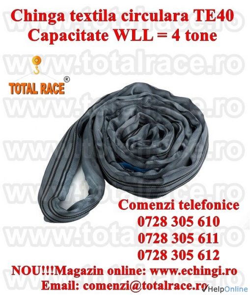 Total Race comercializeaza cu livrare din stoc Bucuresti chinga textila de ridicare circulara capacitate 4 tone lungime utila 1 metru, lungime desfasurata 2 metri, culoare gri, productie Olanda, se livreaza insotite de Declaratie de Conformitate, tabel de sarcini si instructiuni de utilizare.Pentru preturi si disponibilitate stoc accesati magazinul nostru online: www.echingi.ro & www.echingi.com & www.chingiridicare.ro
