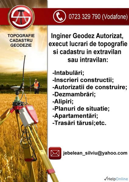 Oferta Prestari servicii Timis - TOPOGRAFIE SI CADASTRU Intabulari ieftine pe zona Timis, Arad si Caras-Severin Inginer geodez autorizat execut: Intabulari constructii, apartamente, terenuri intravilane si extravilane. Dezmembrari, parcelari si/sau lotizari de terenuri. Comasare terenuri...